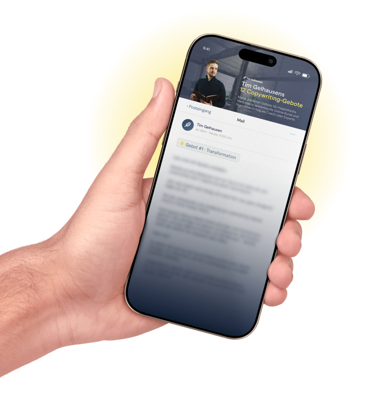 Ich weiß, wie sich das anfühlt. Mein Name ist Tim Gelhausen. Ich bin seit 2015 Copywriter und habe zwei siebenstellige Unternehmen aufgebaut. 2020 habe ich mich entschieden, ein schlankes Business aufzubauen, das nicht endloses Wachstum priorisiert - sondern Freiheit. Ich glaube daran, dass du keinen Hype und keine Marktschreierei brauchst, um deine Angebote zu verkaufen. Und dass dein Business dir ein selbstbestimmtes Leben ermöglichen sollte. Heute sieht mein Business so aus: Ich baue meine E-Mail-Liste auf, schreibe 3 Newsletter pro Woche an über 10.000 Leserinnen und Leser und verkaufe meine Angebote beständig über E-Mail-Marketing. Das Ergebnis: Beständige 5-stellige Einnahmen und ein freier Termin-kalender. Wenn du das auch haben möchtest, bist du hier richtig.